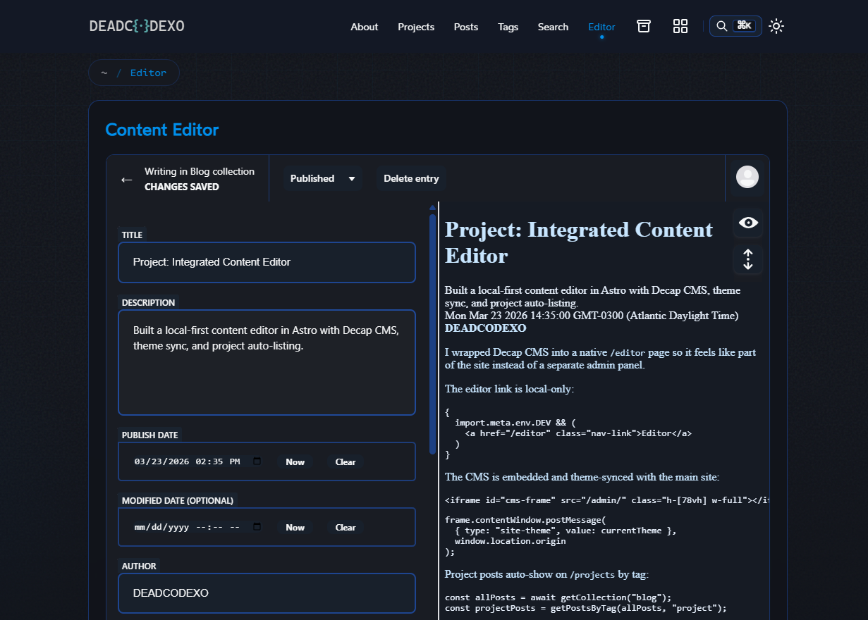 I wrapped Decap CMS into a native /editor page so it feels like part of the site instead of a separate admin panel.